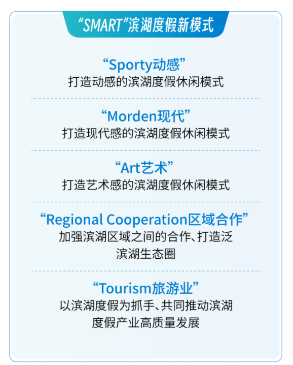 为进一步发挥滨湖旅游资源的优势,提升旅游业对经济社会发展的综合带动效应,助力滨湖旅游高质量发展,丰都南天湖国家级旅游度假区、泰顺廊桥氡泉国家级旅游度假区、宁波东钱湖国家级旅游度假区、新余市仙女湖七夕文化国家级旅游度假区、湖州太湖国家级旅游度假区等五个旅游度假区共同发布了“滨湖度假”宣言,打造“SMART”滨湖度假新模式。