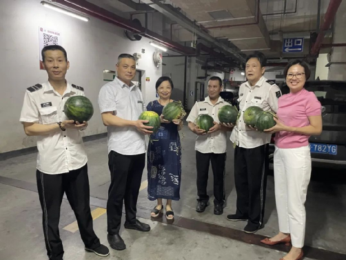 西瓜是夏季最受欢迎的水果之一。它蓬松甘甜的果肉,含有丰富的水分和维生素,不仅能够解渴,还能够降低体温,提供清爽的感受。为了让大家能够尽情享受西瓜的美味,我们特地购买了新鲜的优质西瓜,并将其送到物业员工手中。