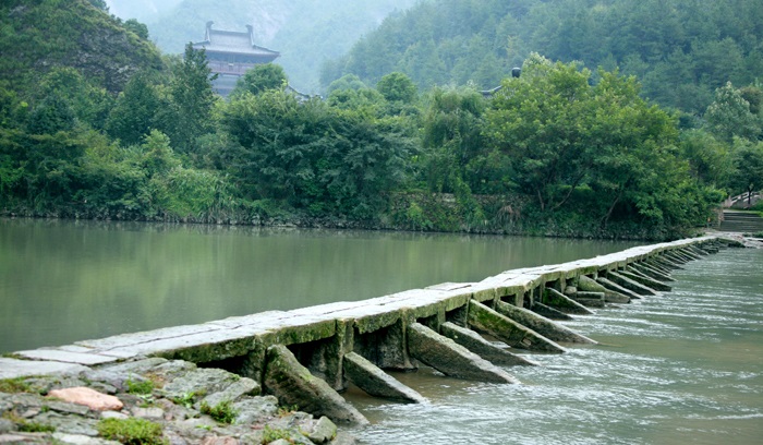 鼎湖峰往北方向有一座石板桥——板堰矴步桥,已然是游人必打卡的经典网红地。矴步桥是缙云古代的典型建筑,桥面与桥柱呈丁字形榫卯交接而成。矴步桥在仙都河道上多处可见,也是仙都的一道独特风景。矴步桥结构合理,形式美观,被“园林之父”上海同济大学陈从周教授称为“古代石板桥的代表”。